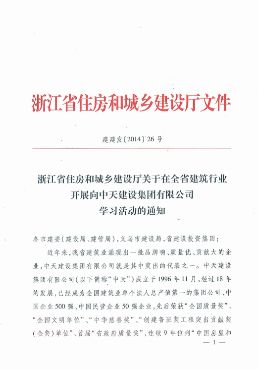 《浙江省住房和城乡建设厅关于在全省建筑行业开展向PT视讯建设集团有限公司学习活动的通知》